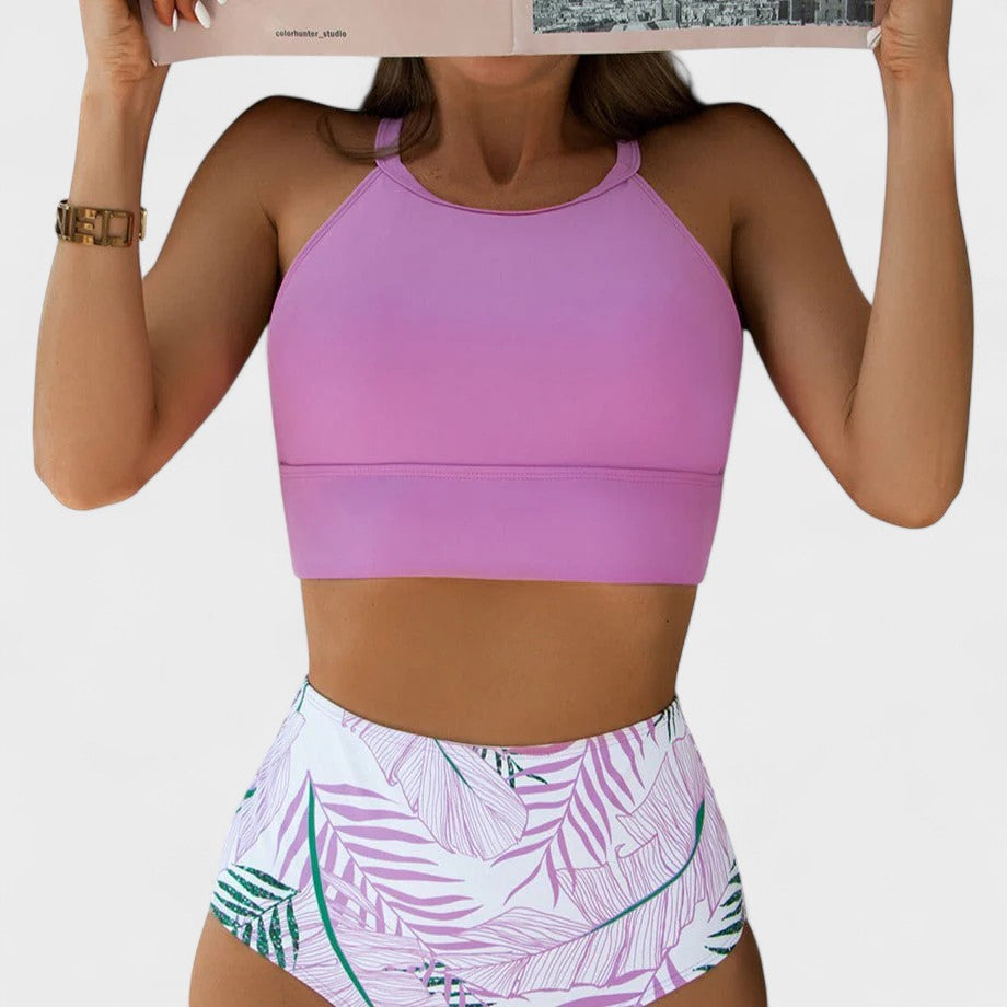 Avasta meie kõrge vöökohaga bikiin, mis ühendab mugavuse, stiili ja kaasaegse välimuse. Sportliku lõikega topp pakub lisatuge ja liikumisvabadust, samas kui botaanilise mustriga aluspüksid toovad esile värske ja rafineeritud ilme.