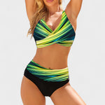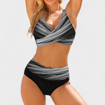 Avasta meie kahekosaline bikiin komplekt, mis ühendab kaasaegse geomeetrilise mustri disaini ja silueti esitlemise kunst. Ristatud V-kaelusega topp tagab suurepärase toe ning rõhutab rinda, samas kui kõrge taljealune toob mugavuse ja peene kujundava efekti.