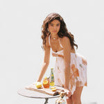 Mini Lilled Kleid kiirgab puhtat romantikat – õrnade lilledega pastelltoonides, halter-kaelusega ja kergete šifoonkihiga, mis langevad võluvalt. Täiuslik aiapidude, suvebrunchide või klaasi roosa veiniga päikese käes.