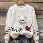 Pidulik ja Stiilne Disain: Sellel on armas lumivalge kass ja elav punane lind, kes istub talveokstel, koos luksuslike pehmete aktsentidega, see kampsun toob jõulude maagia ellu. See on ideaalne segu pidulikust võludest ja igapäevasest mugavusest.