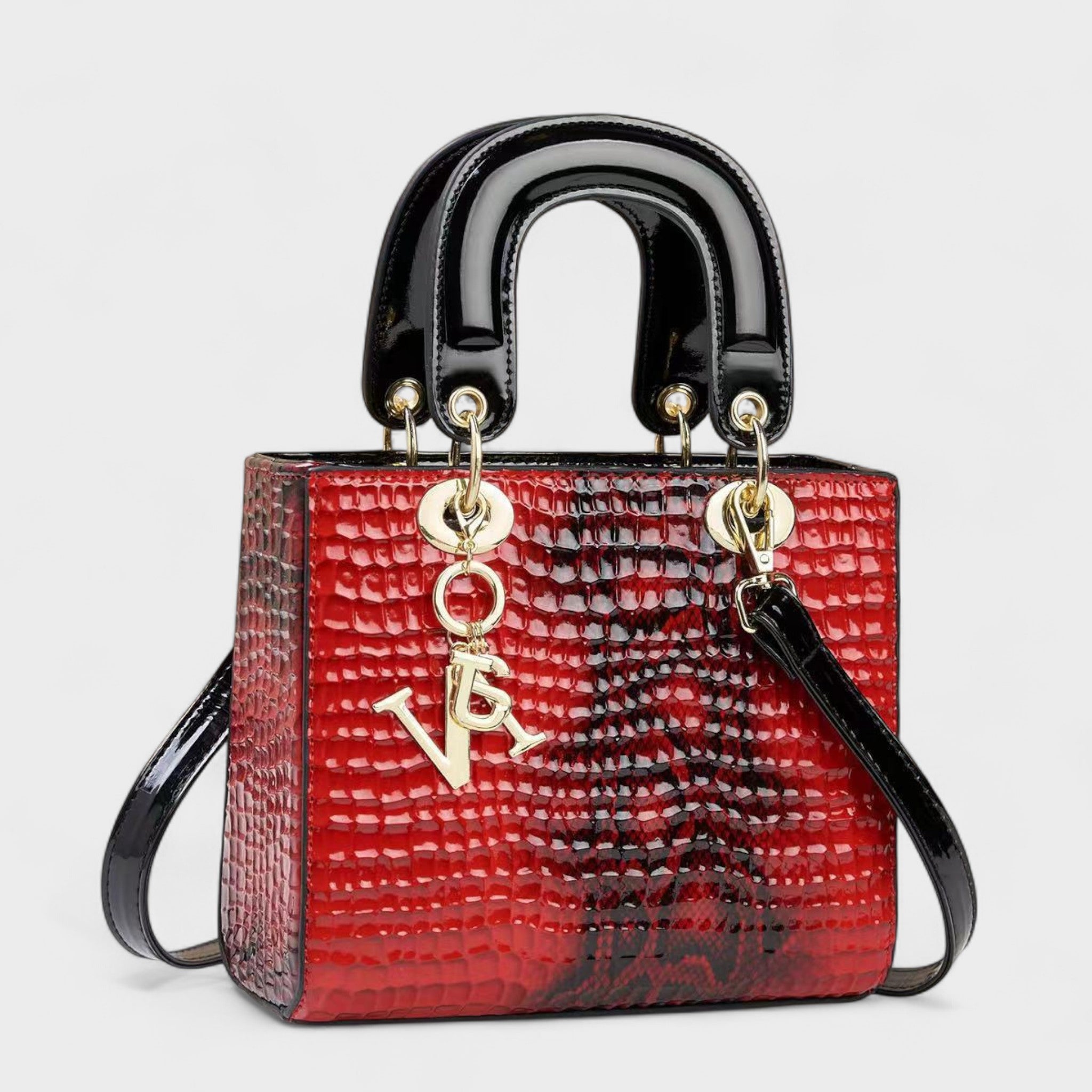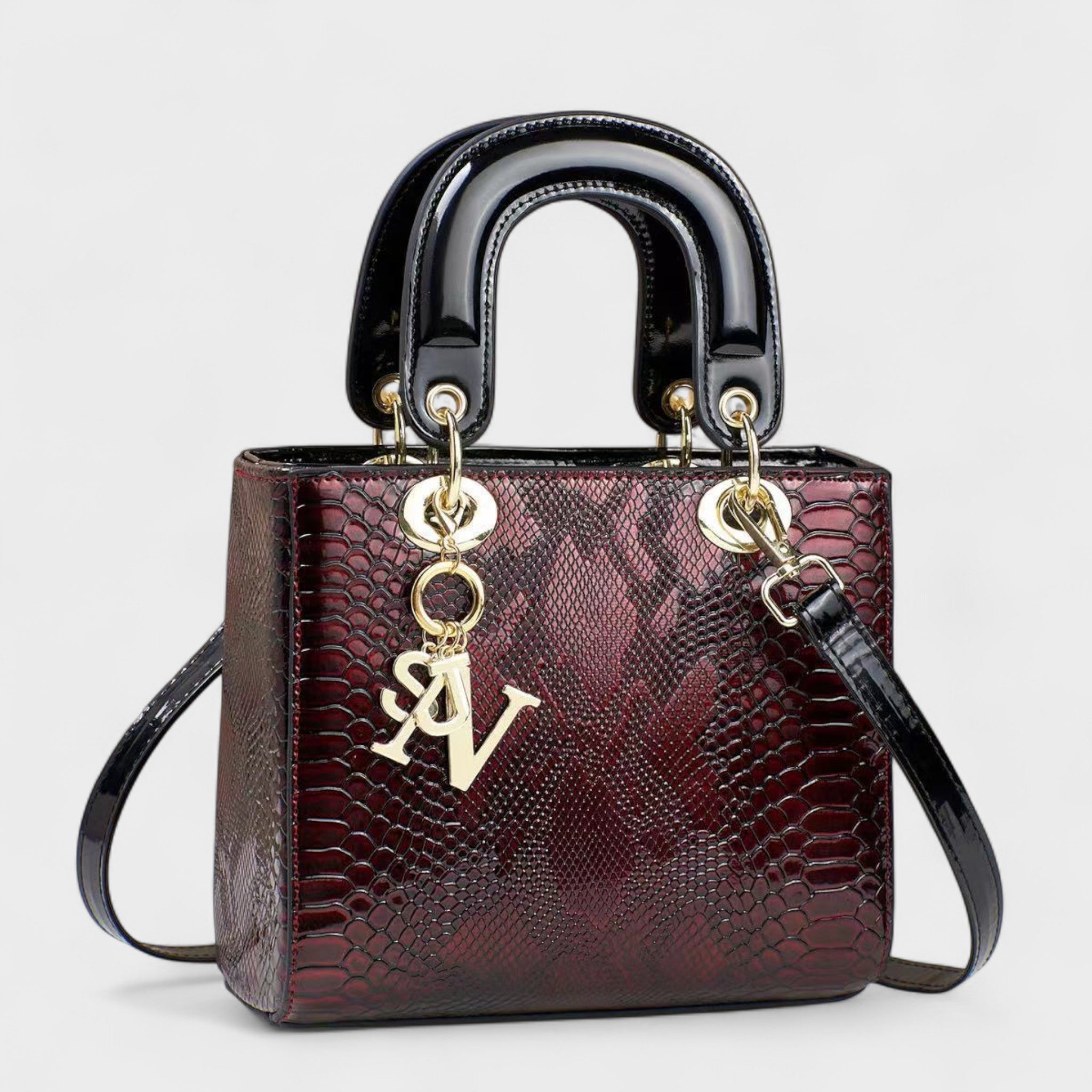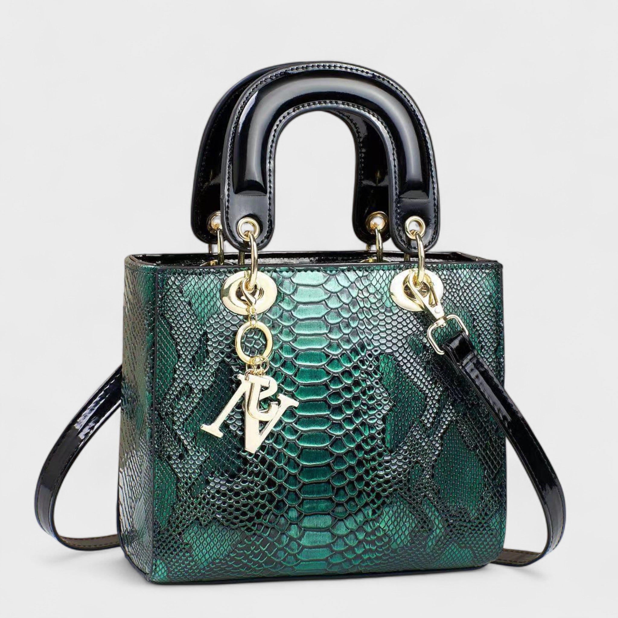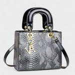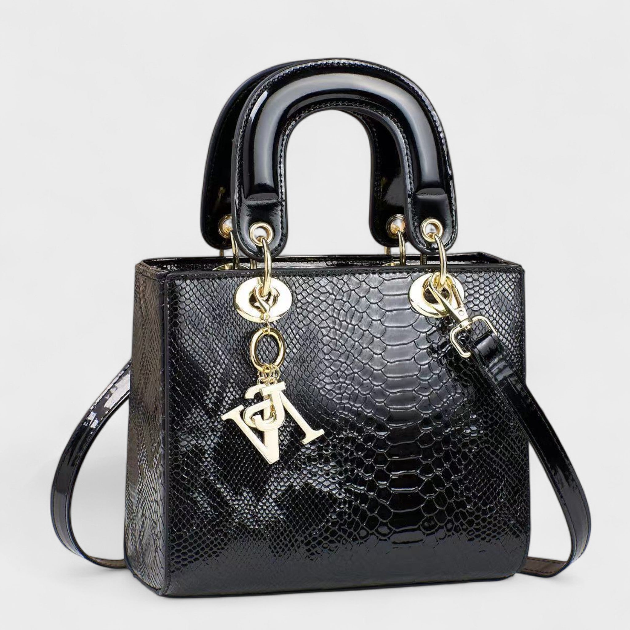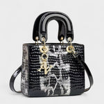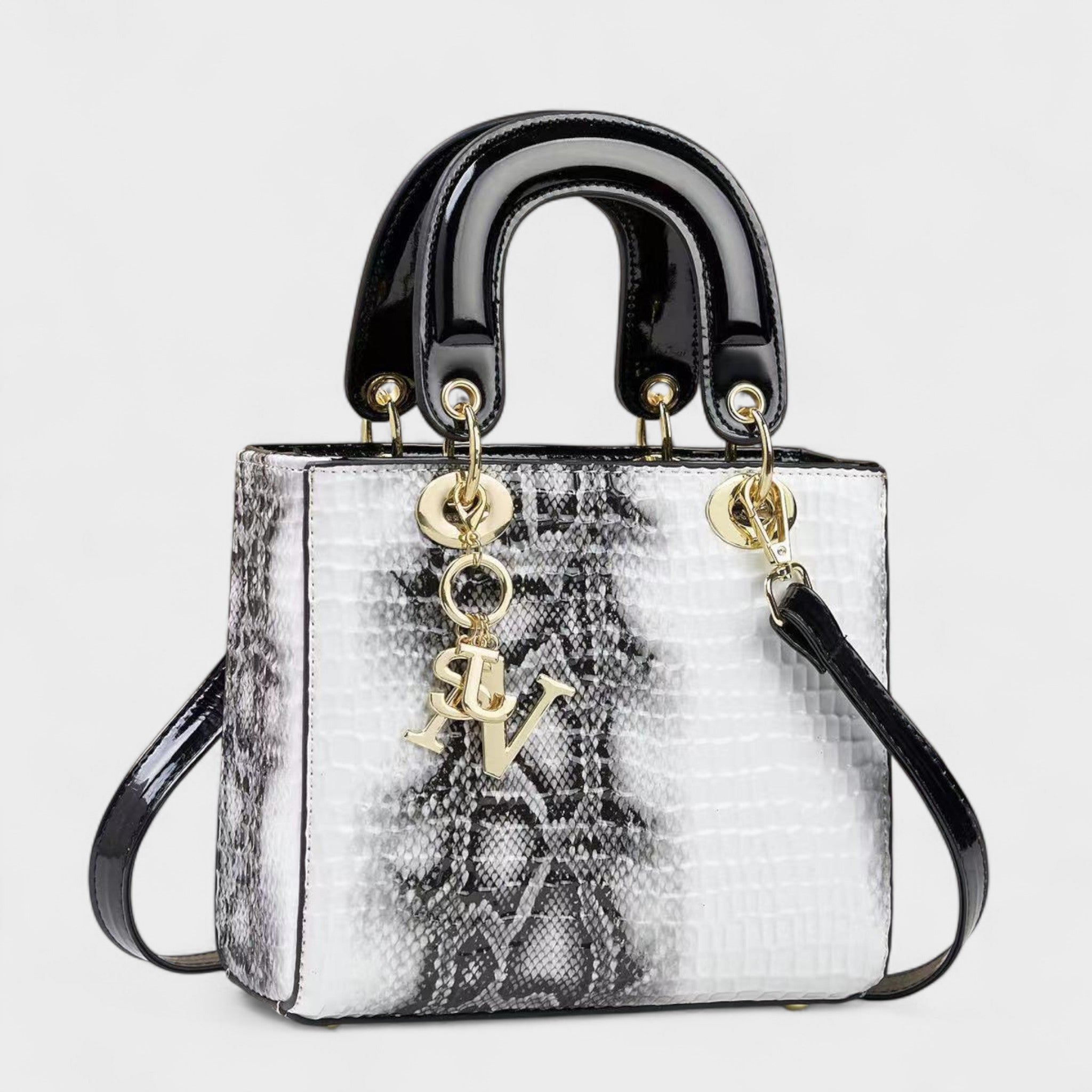 Avastage kott, mis on rafineerituse definitsioon, loomade tekstuuriga ja kõrgläikivate metallosadega. Selle struktureeritud disain sisaldab kahte käepidet ja pikka eemaldatavat õlarihma, mis võimaldab mitmekesisust formaalsetest üritustest kuni lõbusate hetkedeni.