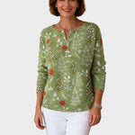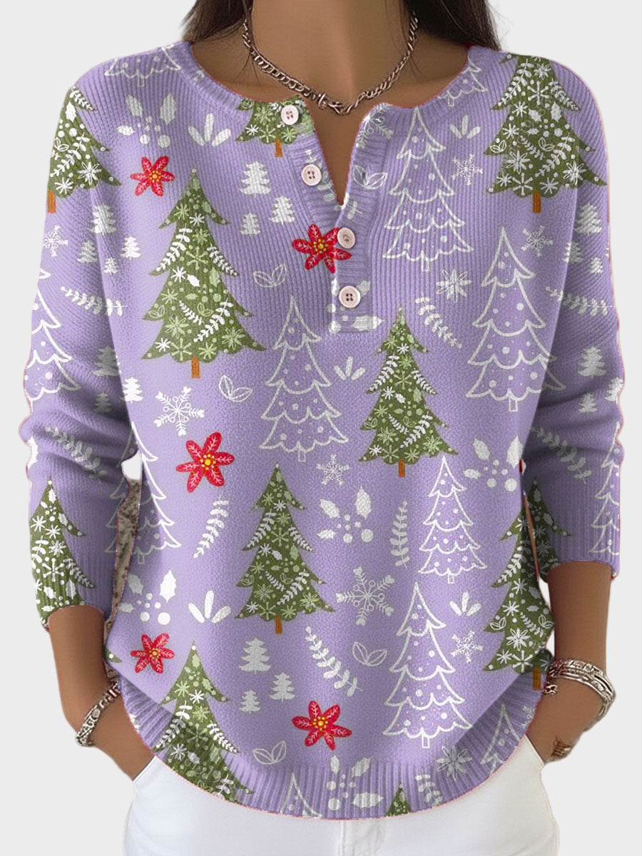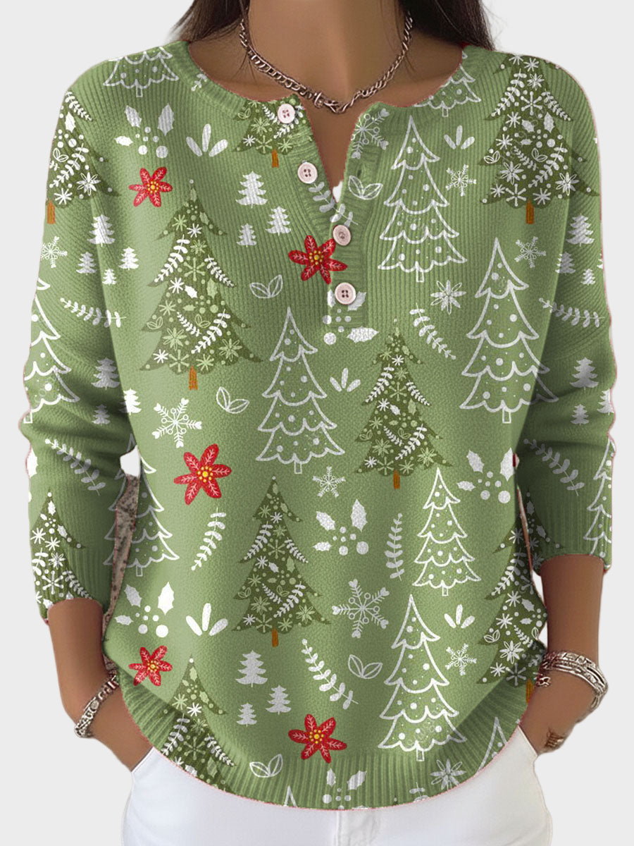 Kristel jumal toob koheselt jõulutunde oma rõõmsa kuuseokste, lumehelveste ja punaste lillede aktsentidega trükiga. Pehme, kudumisega kangas on meeldiv ja hoiab sind sooja hubastes talvepäevades. Dekoratiivne nööpide sulgemine kaelas lisab sellele pidulikule välimusele mängulise ja naiseliku detaili.