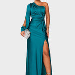 Tee unustamatu sisenemine Laura Kleidiga — ühe õlaga õhtukleit, mis kehastab vaevatut rafineeritust. Valmistatud voolavast kangast, millel on läikiv viimistlus, langeb see kaunilt keha ümber, luues pehme, pikliku silueti. Voogav varrukas ja õrnad voldid liiguvad igal sammul graatsiliselt, samas kui peen külgauk lisab just õige annuse võlu.