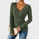Avasta meie elegantne pikkade varrukatega särk, mis on varustatud V-kaelusega ja ülekattumise efektiga, rõhutades sinu talje ilu. Valmistatud pehmest ja venivast ribakujulisest kangast, järgib see keha joont ilma pigistamata.