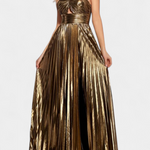 Aikaterini kleit särab majesteetliku kohalolekuga tänu oma metallilisele kangale, ristkübarale ja ettepoole suunatud avausele, millel on strateegilised voldid. Lai siluett langeb elegantselt pahkluudele, luues igas sammus eeterliku liikumise. Tükike, mis on mõeldud silma paistma valgustes ja jätma jälje igas ürituses.